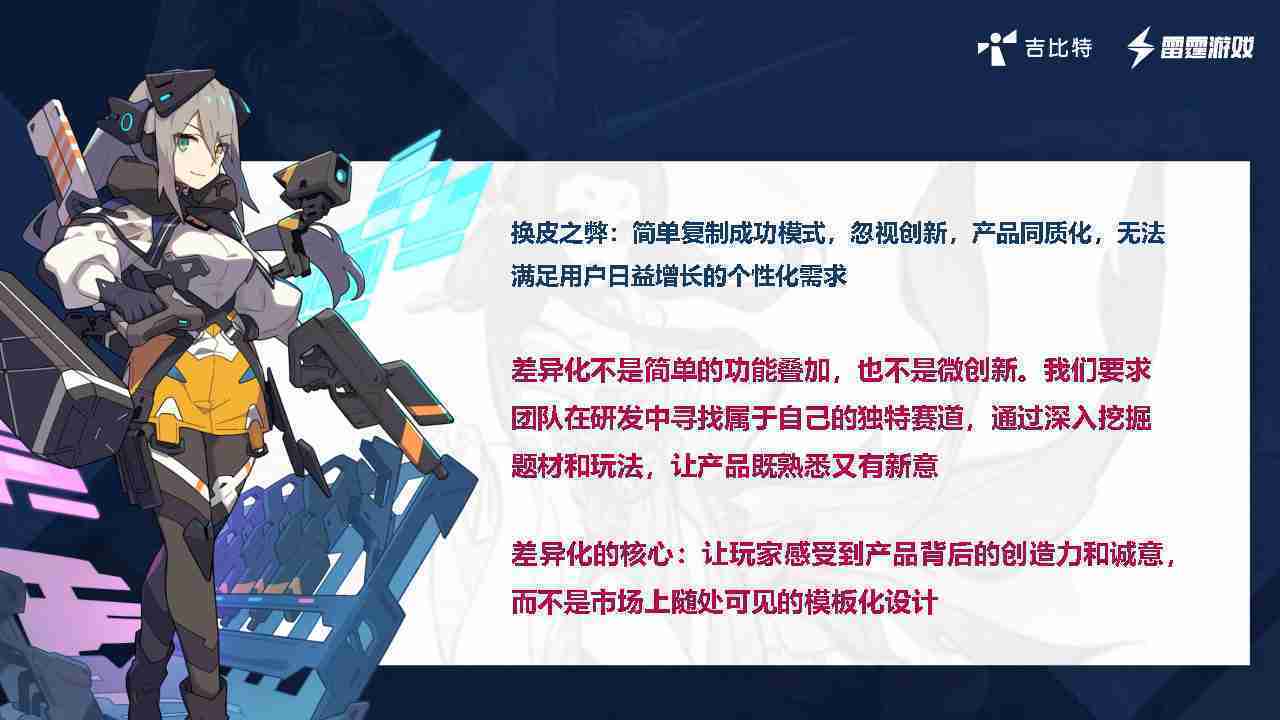 在我们内部是这么定义差异化的。。首先,,,差异化不是简单的功能叠加,,更不是换皮。。。只是换皮,,产品无法提供有效的市场价值。。。。内部经常说差异化的产品不是为了迎合市场,,,而是找到一个自己独特的表达方式,,,,在研发中找到属于自己的细分赛道和独特赛道,,,前提是需要对这个题材有足够的深入、、、、挖掘,,,,对玩法有足够深入的理解,,,,让产品看起来既熟悉又有新意。。。