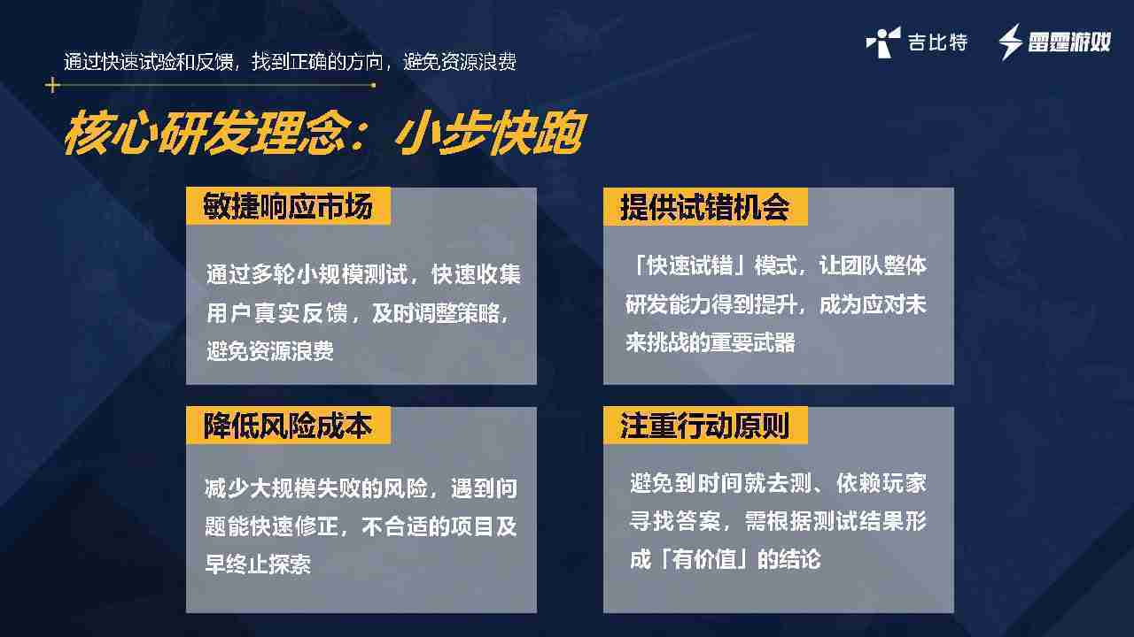 小步快跑不是找答案,,,而是验证答案。。。。我们之前有项目是这样的,,,有些制作人会有几个方向觉得都可以做,,,但是不确定做哪一个,,,,会选择几个都做,,,,做完拿到市场跑,,跑出哪一个更好,,,基于这个再做后续的研发和拓展。。。。但这种情况最容易出现一个问题,,,,可能被玩家裹胁,,,,玩家说这个点不错、、、、那个点不错,,,到底听还是不听,,不听感觉是无视玩家的反馈,,,,听的话,,,可能自己没想清楚导致研发思路发生偏颇。。所以针对这一点后面自己复盘整理,,,,发现制作人自己心里要有数,,,,要做自己觉得好玩的,,而且明确知道这个东西是你想做的,,然后拿到市场验证这个答案是不是对的,,,而不是拿一堆答案找哪一个答案更好。。