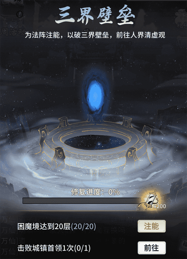 当你修为达到返虚/破虚中期后,,,,可在城镇寻得芸丫并激活神秘法阵,,,通过收集材料、、、击败首领等方式为法阵注能,,借以打破三界壁垒,,开启支线剧情“清虚旧梦”